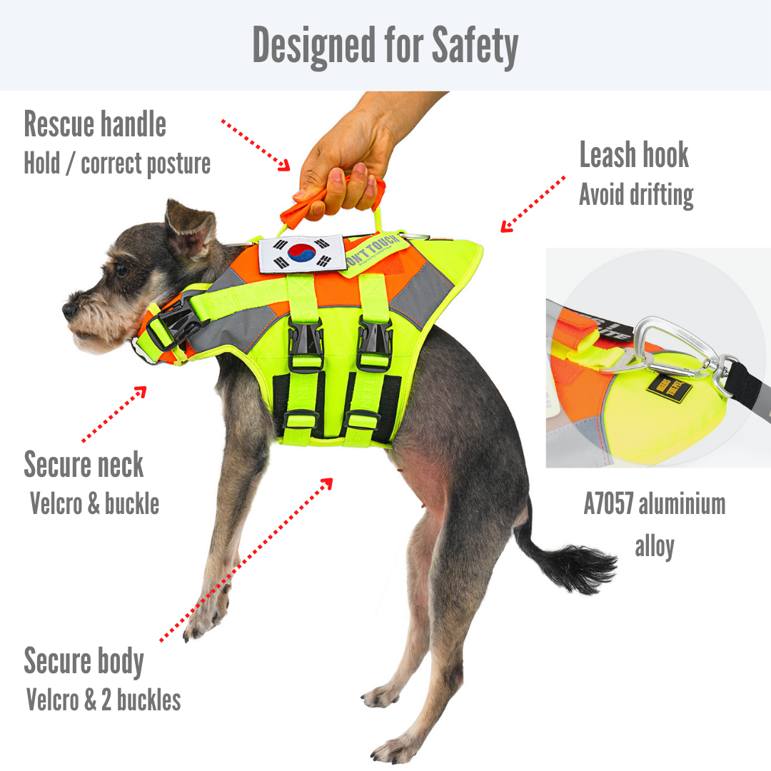 A high buoyancy life jacket/swim vest designed to keep your pet safe and comfortable in water