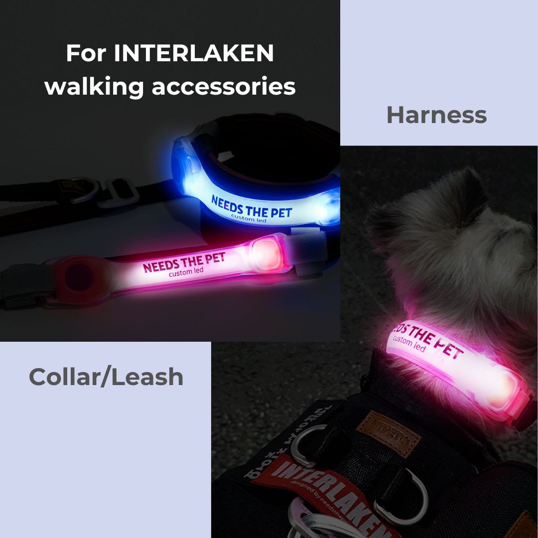 Designed to fit INTERLAKEN collar, harness and leash, the LED band is water-resistant and offers 2 lighting modes